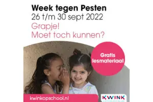 Kwink is de methode voor sociaal-emotioneel leren. Onderdeel van sociaal-emotioneel leren (SEL) is het preventief werken aan SEL om pesten te voorkomen. Dat is de reden dat Kwintessens dit gratis katern graag aan alle scholen aanbiedt. Passend bij het thema van de Stichting School & Veiligheid: “Grapje! Moet toch kunnen?!”. Plagen kan leuk zijn. Een grapje ook. Maar als plagen pesten wordt, is het allesbehalve een grapje. Dan wordt het structureel en is vaak één kind slachtoffer van een pester die gesteund wordt door meelopers. Dat mogen we nooit accepteren! Dat is het thema van de Week Tegen Pesten. In dit katern vind je achtergrondinformatie en tips voor alle groepen in de school. Veel succes!